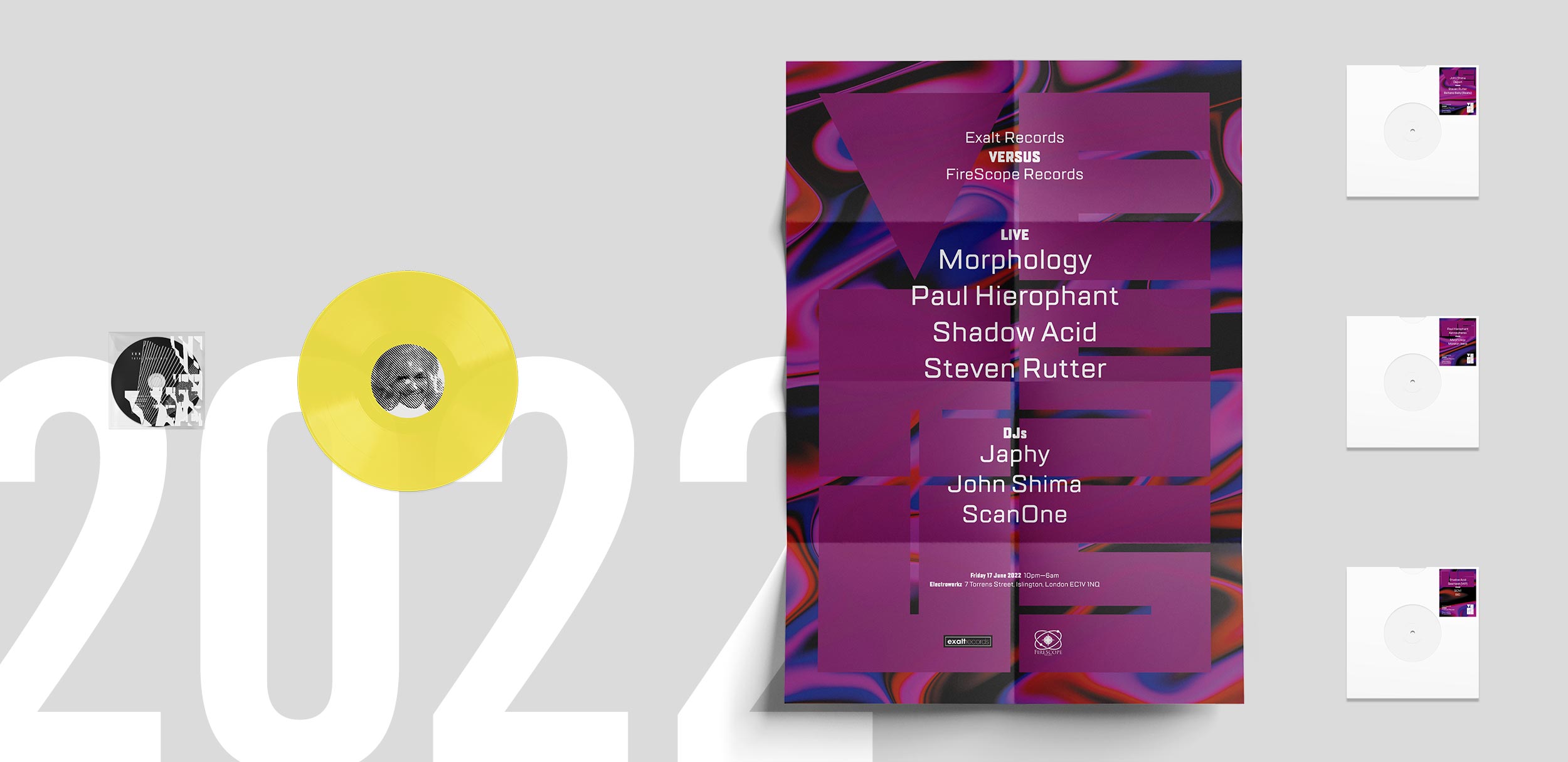 A live event jointly hosted by both record labels in London in June 2022. As well as social media promotional graphics, I also designed the labels for a limited edition set of three lathe cut 7"s (above) which were sold bundled with an A2 folded poster (below) at the event.