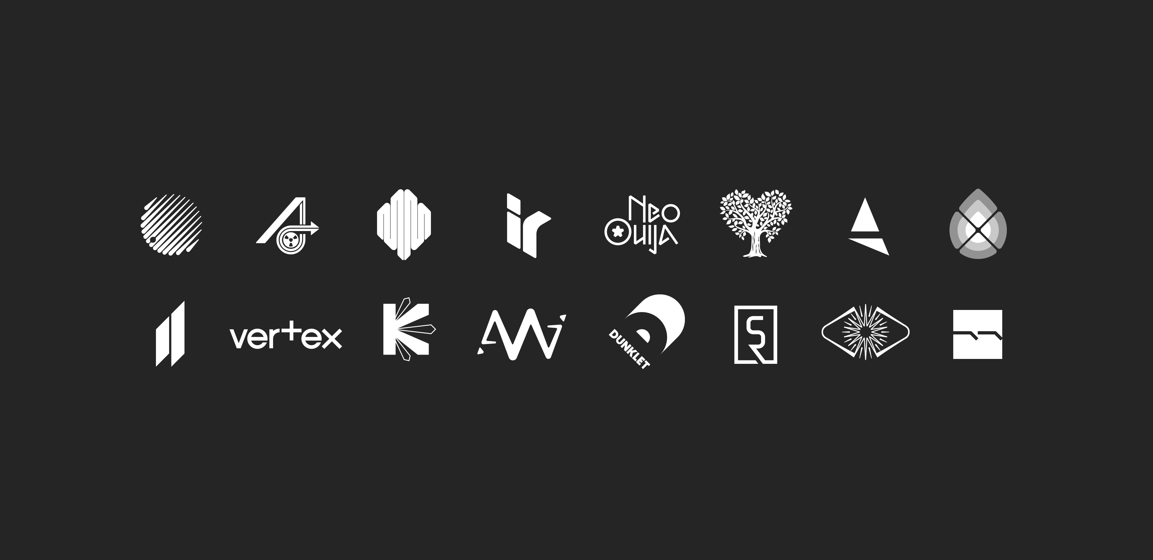 Abstract wordmark for electronic music label Dyadik. Each letter of the wordmark is made from two shapes (Dyadic means something that consists of two parts or elements). See how the concept works along with the branding, including custom font and album artwork, on the project page.